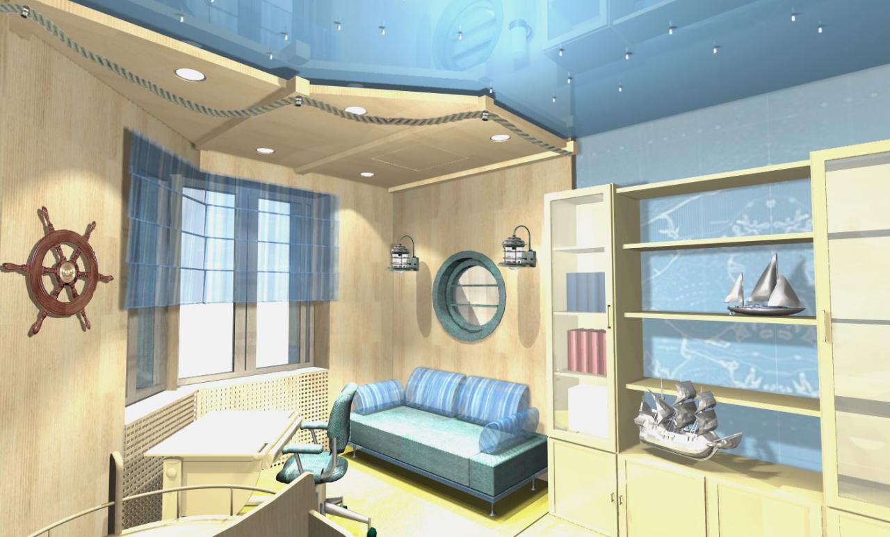 Итак, детская выполнена в морской, корабельной стилистике. Причём цвета и материалы подобраны так, что действительно ощущаешь себя на корабле!
