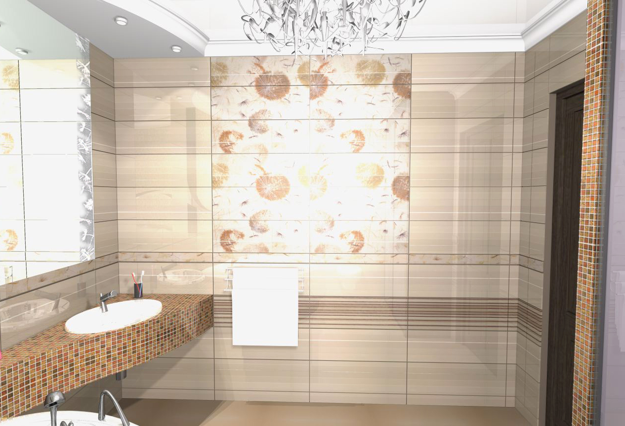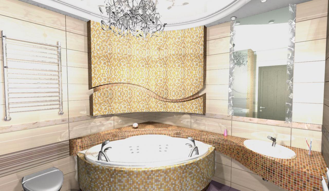 Сочетание формы, цвета и материалов (в том числе и мозаика, набранная по оригинальному рисунку дизайнера), использованных для оформления, сделали из простой ванной просто-таки произведение искусства.