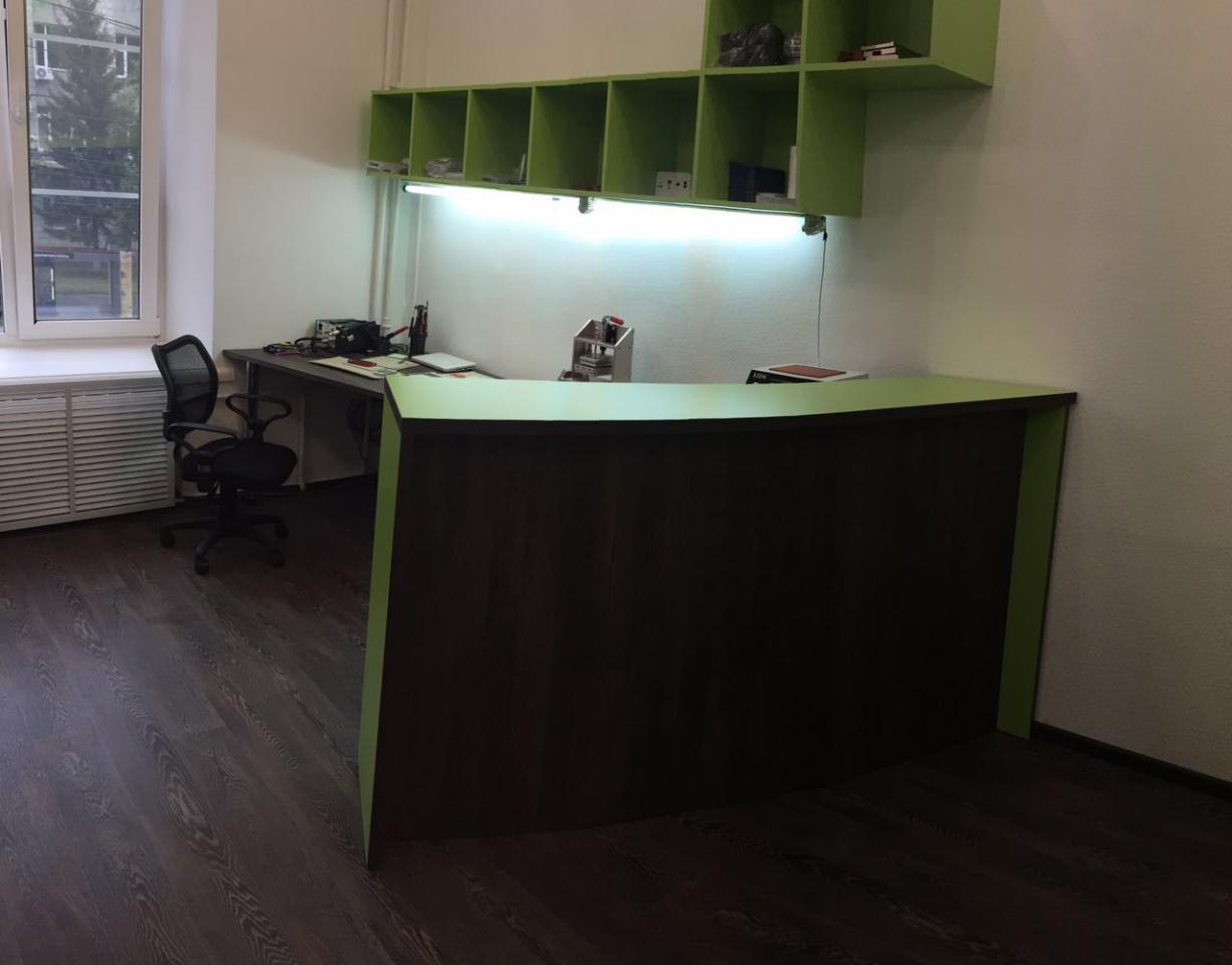 А вся офисная мебель (кроме дивана и кресел) спроектирована эксклюзивно нашим дизайнером с учётом пожеланий заказчика.