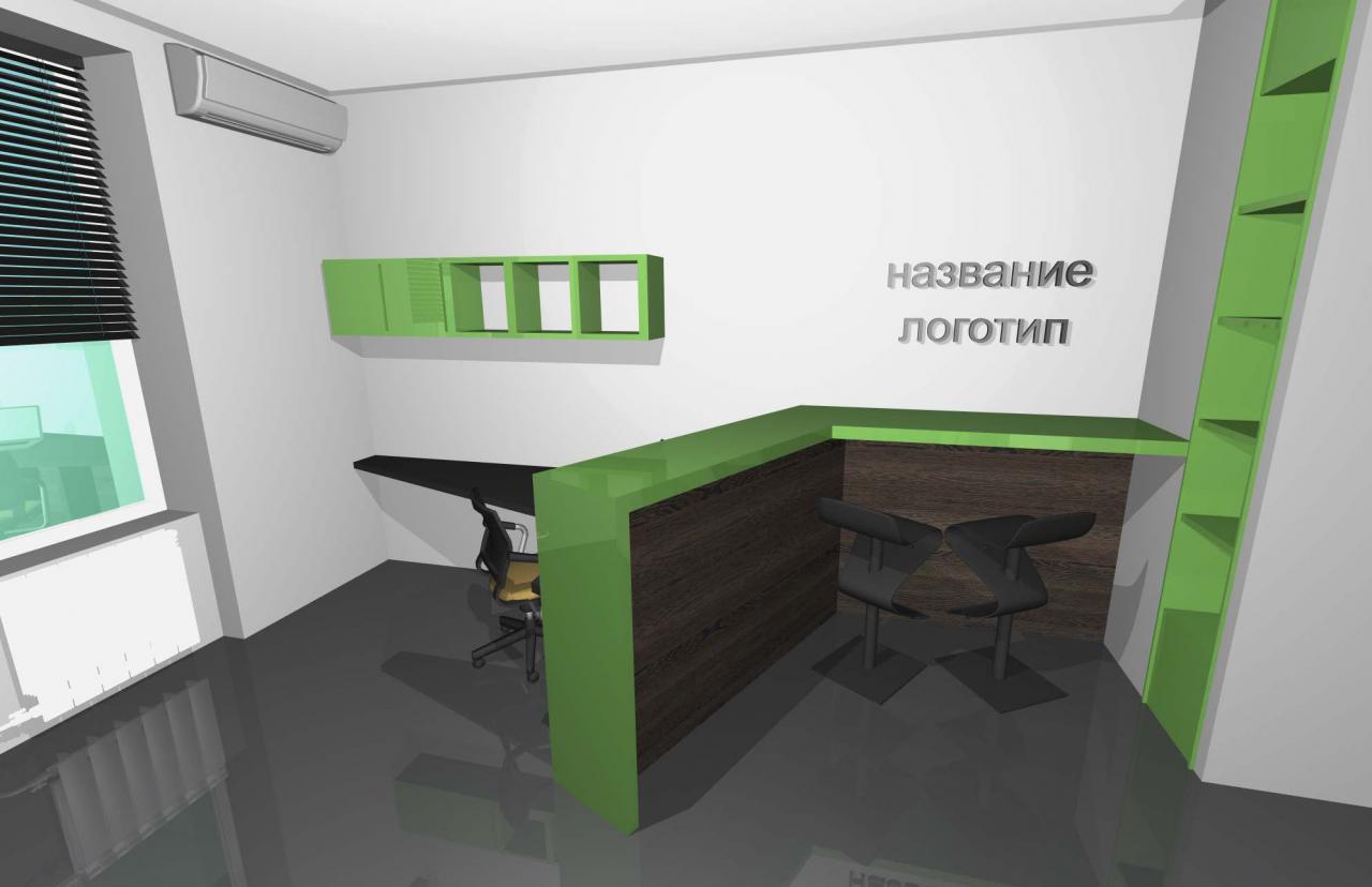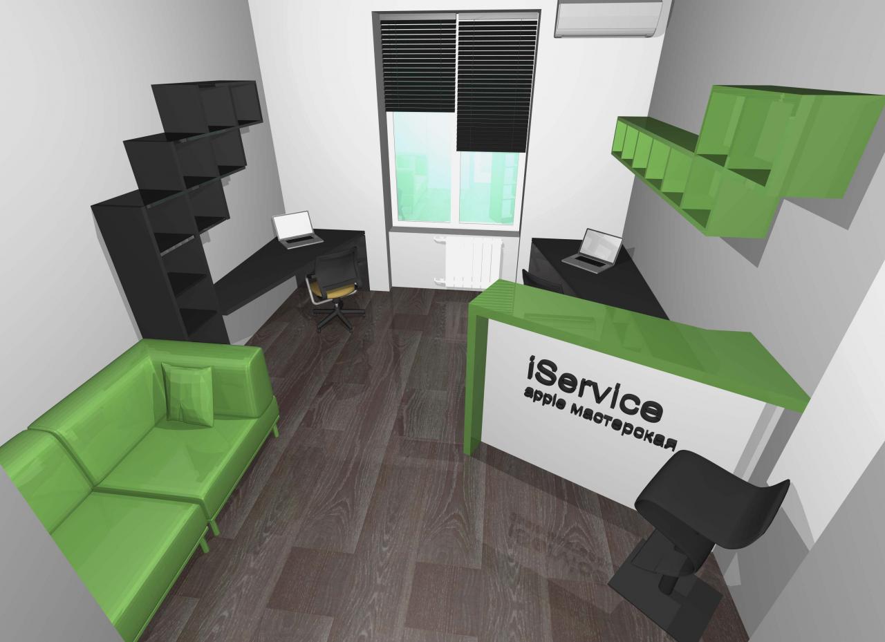 Сыну одной из наших любимых клиенток, начинающему, но уже подающему надежды предпринимателю, понадобилось спроектировать интерьер первого офиса для его фирмы, занимающейся продажей и ремонтом цифровой техники Apple (и не только). Соответственно, главное пожелание по проекту - уложиться в бюджет, но получить оригинальный и симпатичный офис.